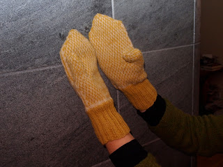 No sitten on tämä isosisko, jolle päätin "huitaista" jotain myös. Haaviston lapasmallit ovat odottaneet puikoille pääsyä jo pitkään. Posiolta viime kesänä ostamani koivulla värjätty keltainen villalanka huuteli Haaviston suuntaan ja sille kaveriksi löytyi omista kätköistä luonnonvalkoinen villalanka, joka luultavasti on Tammelan torilta anopin tuomaa. Yritin muutamaa muutakin lankaa mutta heti kättelyssä kävi selväksi, että Haaviston lapasmallit vaativat todella ohutta lankaa. Viksumpi olisi varmaan tajunnut sen heti siitä, että silmukkamäärät huitelevat 60:stä ylöspäin. Malliksi valikoitui nro 89 Rovaniemi, joka on mielestäni yksi kirjan kauneimmista.